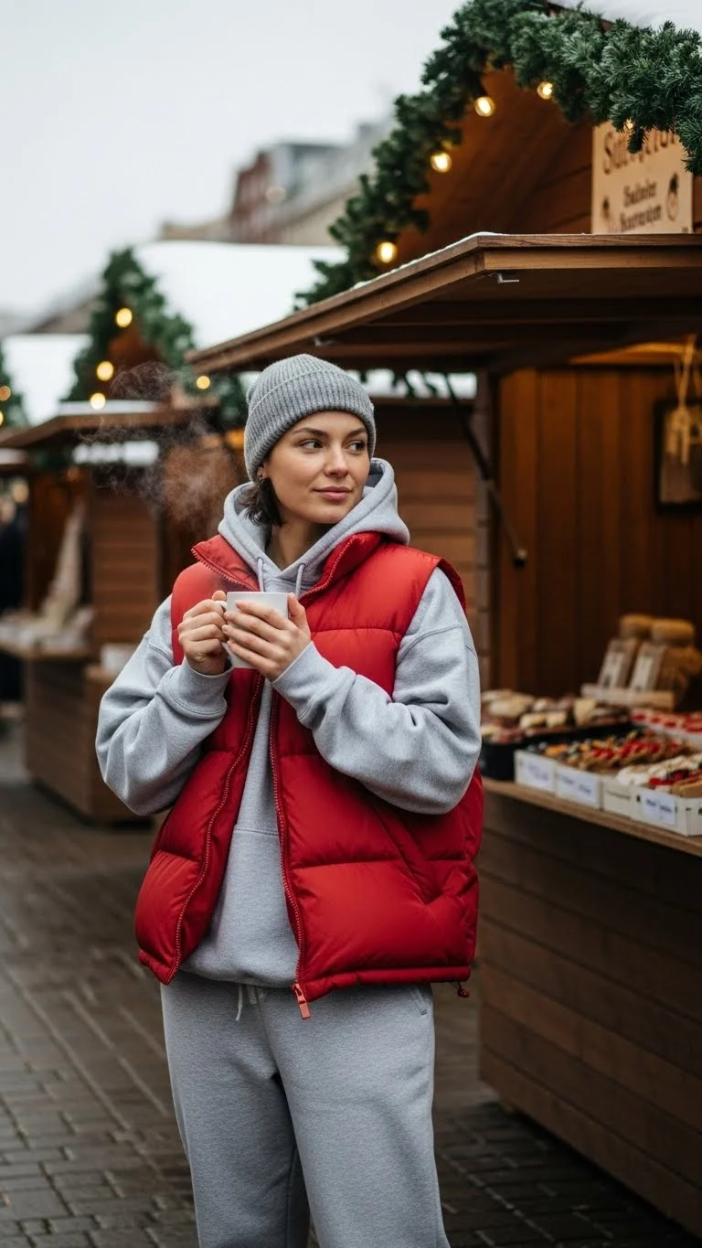 - Cozy Sweats With a Red Puffer Vest