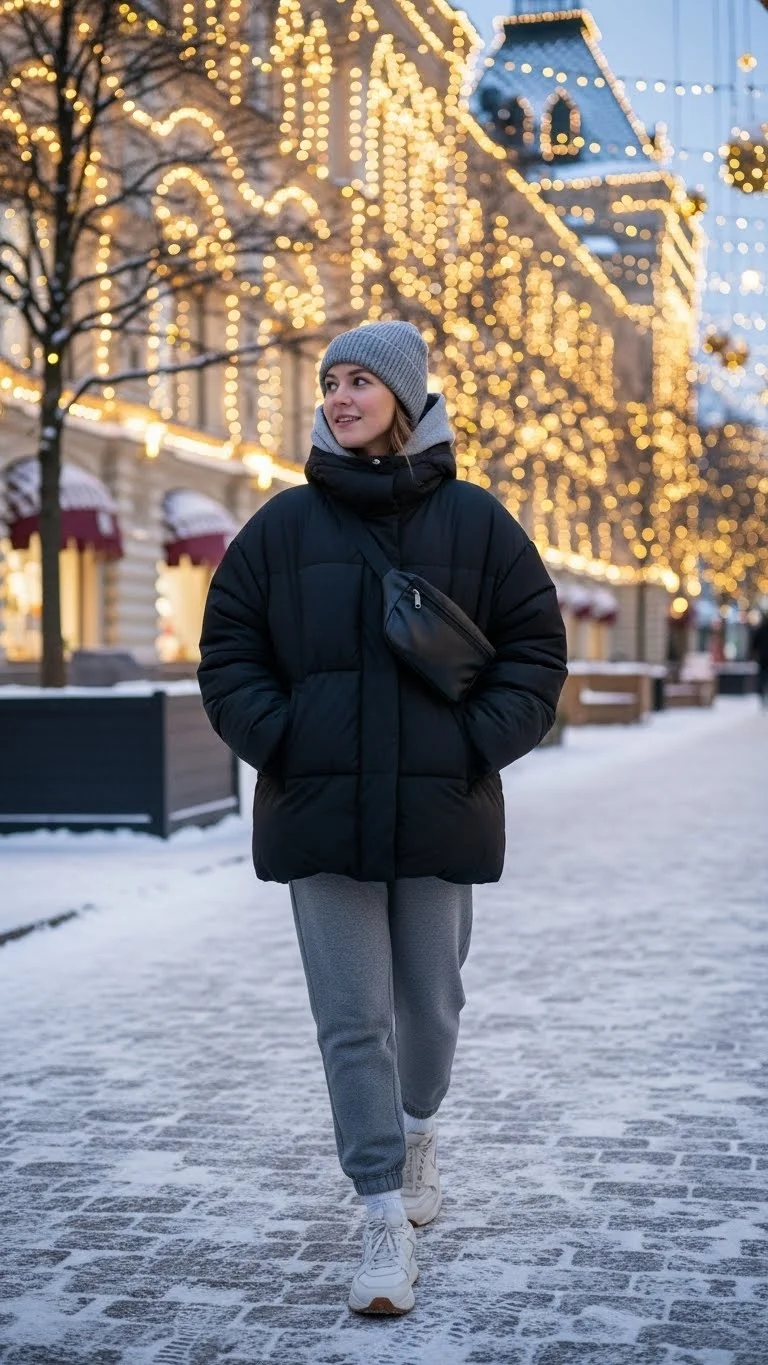 Pair a puffer jacket with joggers for comfort.