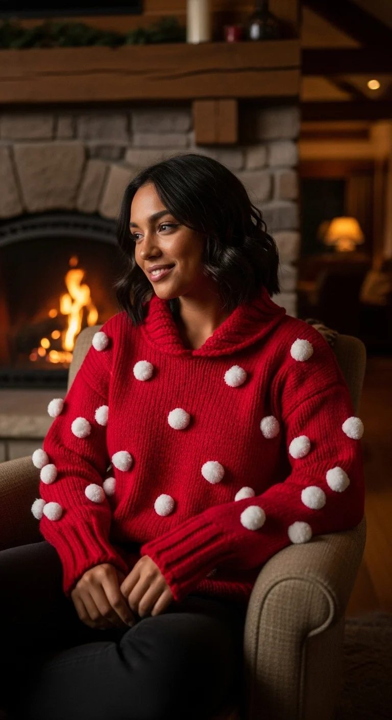 Pom-poms add fun texture and dimension. Pair with dark bottoms. Budget-friendly: Stores carry options under $30. DIY: Sew on additional pom-poms to plain sweaters. Great for casual holiday days or family photos.