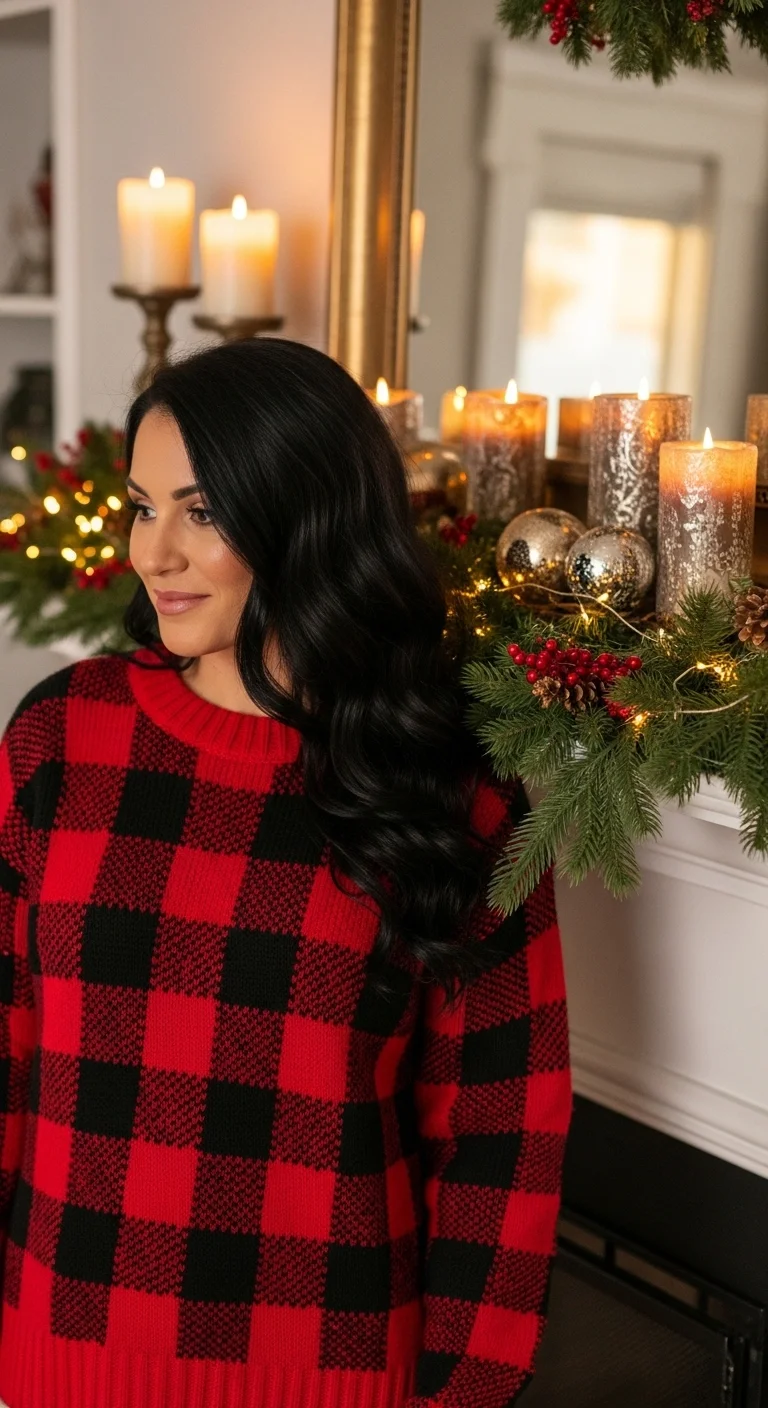 Plaid sweaters feel classic and warm. Pair with boots or cozy slippers. Budget tip: Thrift stores often carry plaid knits for under $20. DIY: Add small buttons or patches for a festive touch. Works for casual gatherings or cozy nights.
