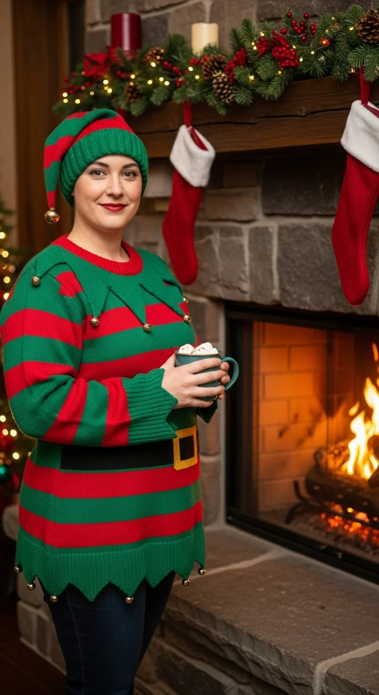 Elf-inspired sweaters are whimsical. Pair with leggings or jeans. Budget tip: Affordable sets under $30. DIY: Add pom-poms or small felt collars. Works for playful holiday parties or themed gatherings.