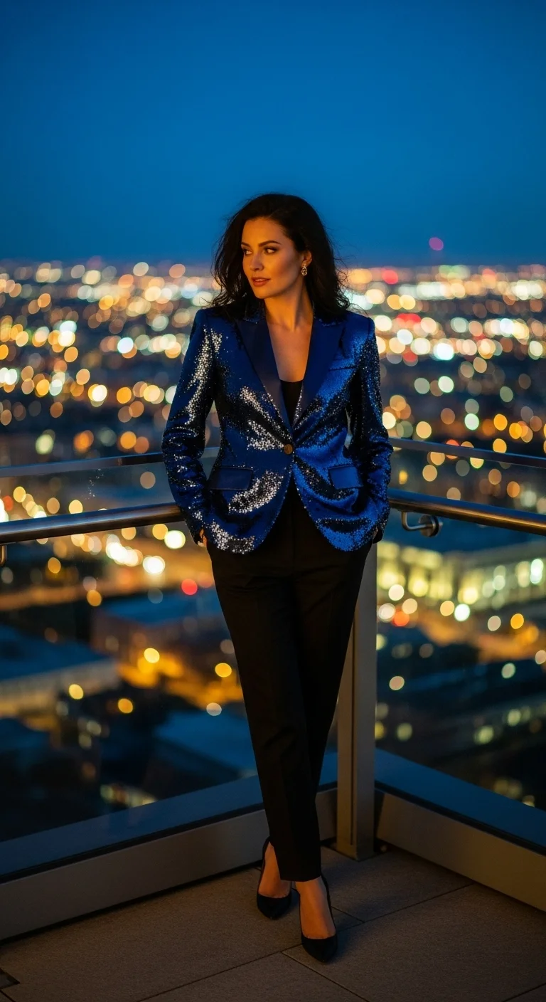 A sequin blazer adds sparkle without a full dress. Pair with neutral pants for balance. Flats or heels both work. Budget tip: Online sales or thrift stores offer affordable options. DIY: Glue sequins to a plain blazer for a custom look. Great for evening gatherings or office holiday parties.