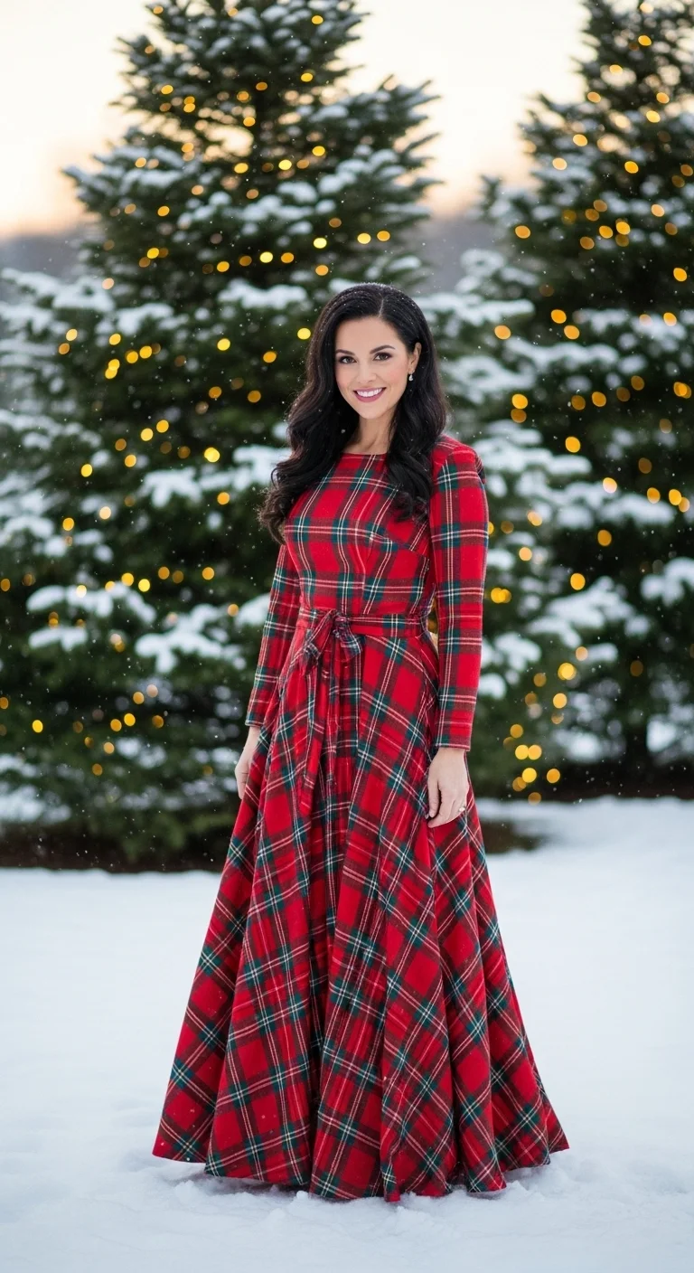 A tartan dress is classic and festive. Pair with boots or flats. Budget tip: Tartan pieces are easy to find during the season. DIY: Add a belt or sleeve embellishments. Perfect for daytime gatherings or casual dinners.