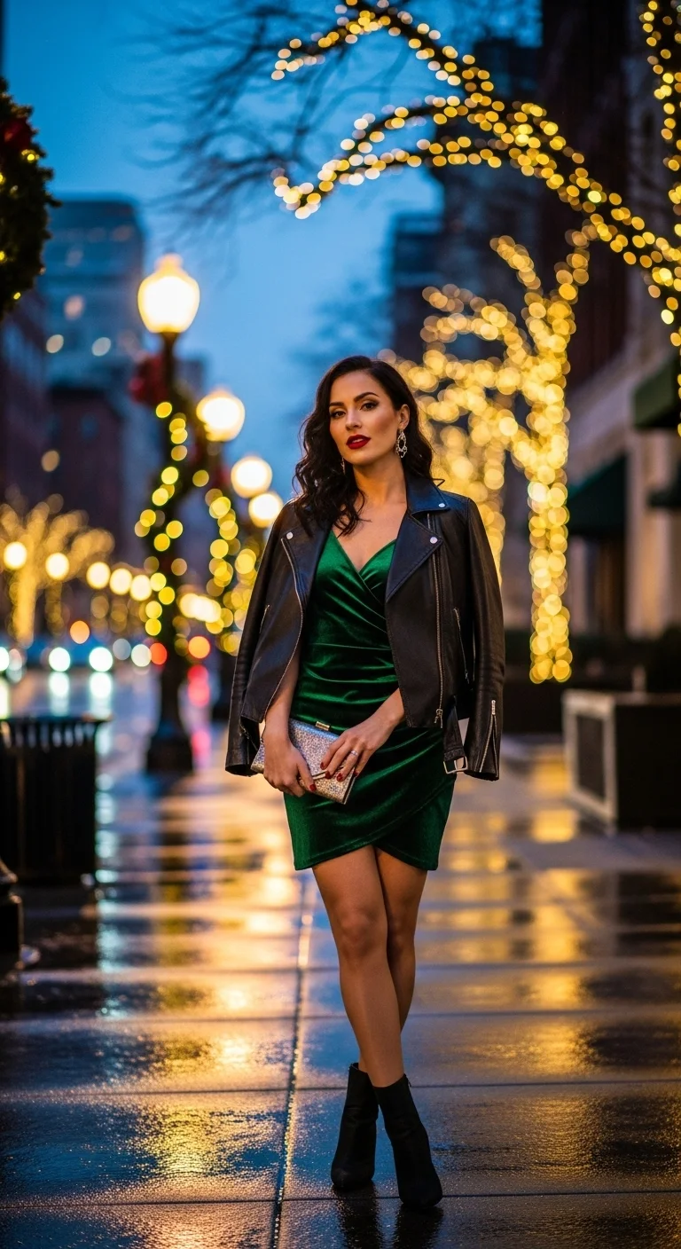 A leather jacket over a festive dress adds edge to a holiday look. Pair with boots or heels. Budget tip: Thrift stores offer leather jackets for under $50. DIY: Add studs or patches. Works well for evening parties or casual night events.