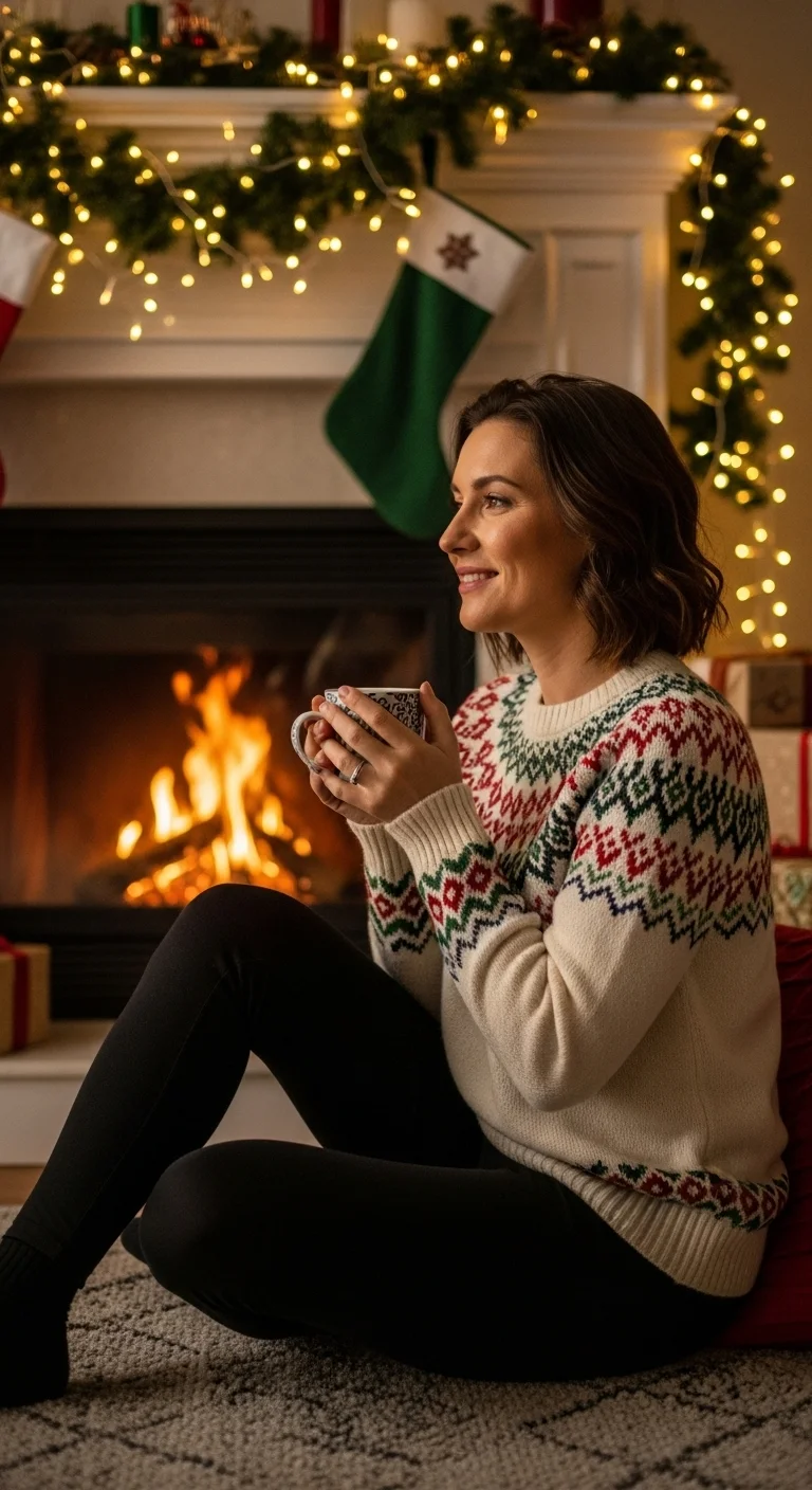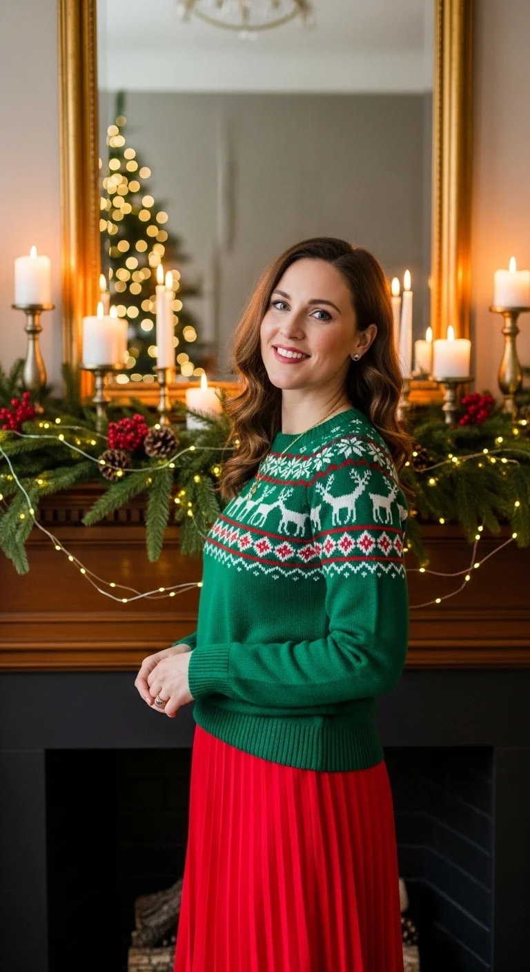 A Fair Isle sweater is playful and cozy. Pair it with leggings or skinny jeans for a relaxed vibe. Boots or slippers complete the outfit. Budget tip: Classic patterned sweaters are often discounted during the season. DIY: Add small felt shapes or sequins for a festive touch. This outfit is ideal for home celebrations or casual family events.