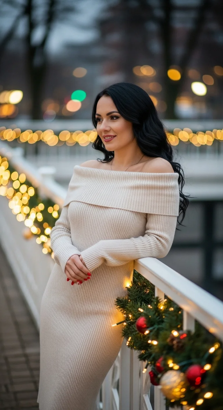 An off-shoulder sweater dress is cozy and stylish. Pair with tights and boots. Budget tip: Sweater dresses are widely available under $50. DIY: Add buttons, patches, or embroidery. Great for casual parties or relaxed family gatherings.