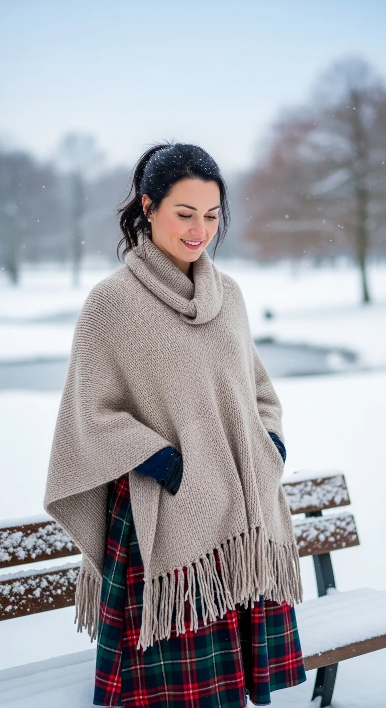 A knit poncho with a skirt is effortless and warm. Pair with boots or flats. Budget tip: Ponchos are inexpensive at thrift stores or online. DIY: Add fringe or embellishments. Works for casual holiday outings or outdoor gatherings.