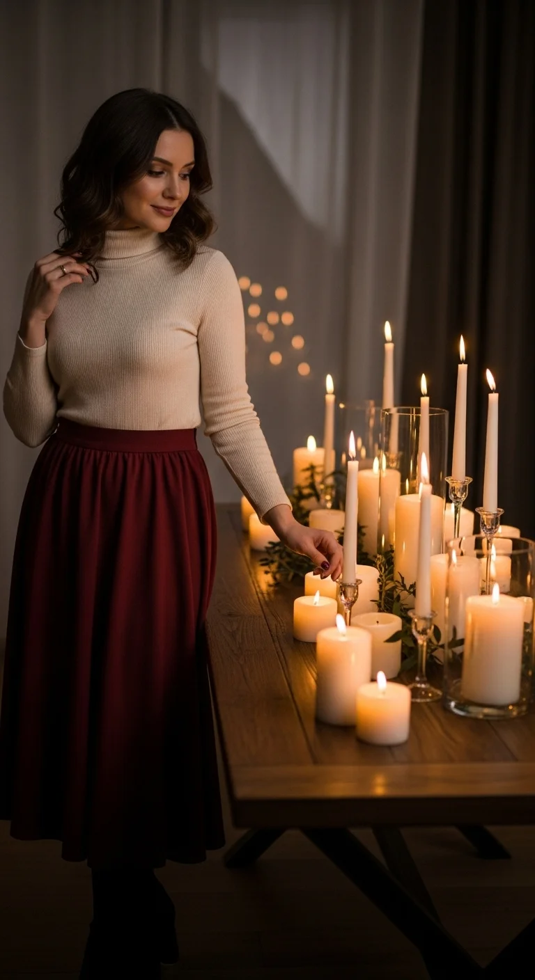A turtleneck paired with a midi skirt is sophisticated and comfortable. Add boots for warmth. Budget tip: Turtlenecks and skirts are widely available for under $40 each. DIY: Add ribbon belts or buttons for a personalized touch. This outfit works well for brunches, casual office parties, or family dinners.