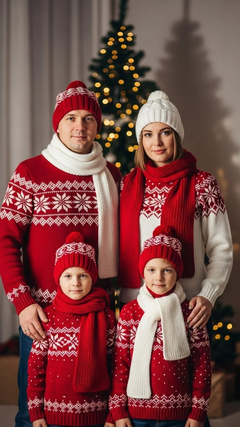 A red-and-white theme works well for both indoor and outdoor photos. You can pull pieces from your closet and still make the group look put together. Keep it simple with red sweaters, white tops, or small patterned touches to tie everyone together. Add white beanies or red scarves for quick accents. Kids can wear red dresses or white cable-knit sweaters. If you’re on a tight budget, let one person wear a bold red piece while everyone else sticks to neutrals so the colors still tie together.