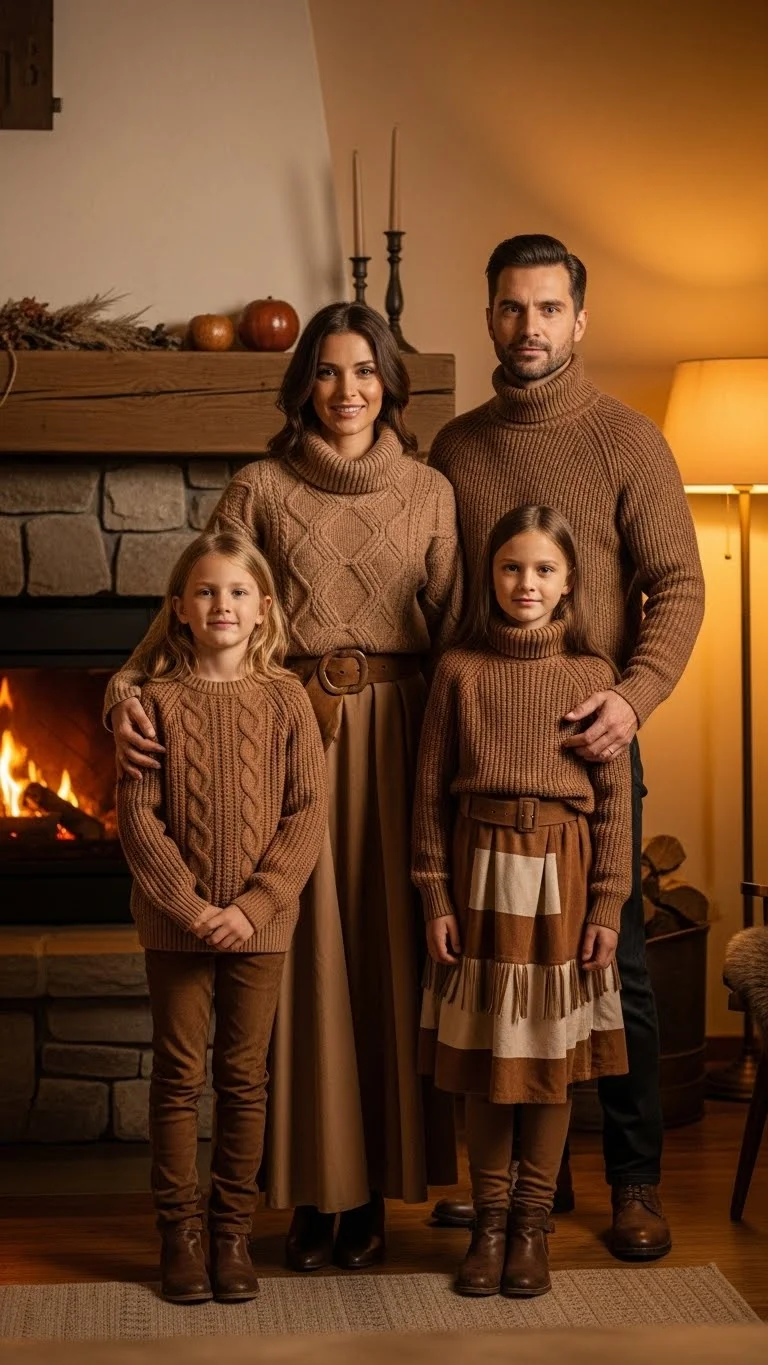Brown tones create a grounded, cozy look. Choose caramel, mocha, or chocolate shades and mix them across sweaters, jackets, and pants. Kids look adorable in corduroy overalls or brown knit sets. Add cream or white layers to brighten the overall look. If you’re budget-conscious, use neutral blankets or scarves as accents. This earthy palette works well in woodsy outdoor settings.