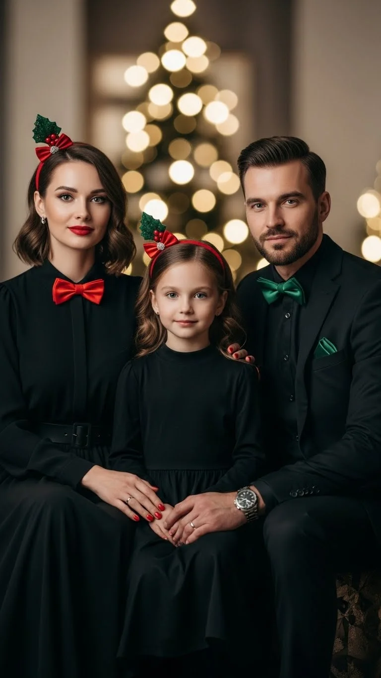 Black outfits make coordinating simple. Everyone likely already owns pieces, so this idea is budget-friendly. Add holiday touches like red scarves, green bows, or gold jewelry to bring in color. Kids can wear black dresses with small festive accents. Keep shoes neutral so the look stays clean. This approach works especially well indoors with warm holiday lights.