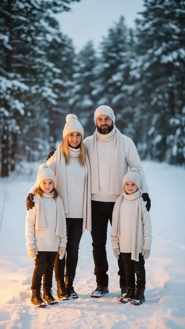 All-white outfits look soft and bright in Christmas photos. Mix different fabrics like knits, fleece, and cotton for texture. Kids can wear white sweaters, leggings, or simple dresses. Add subtle beige or cream accents to avoid flatness. If you’re saving money, you can repurpose white school shirts under cozy layers. This style works beautifully near trees, garlands, or snowy outdoor spots.