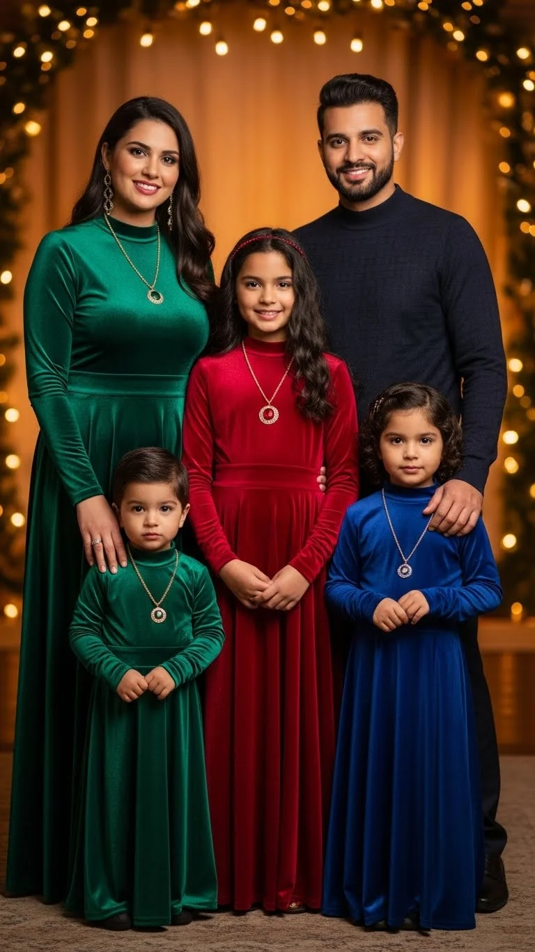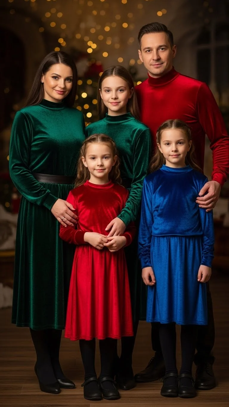 Velvet always feels festive, even in simple pieces. Adults can wear velvet tops or skirts, while kids look cute in velvet dresses or jackets. Choose deep tones like emerald or burgundy for a polished effect. If you’re saving money, mix velvet with non-velvet basics to keep costs down. Add minimal accessories because velvet already adds enough texture for photos.