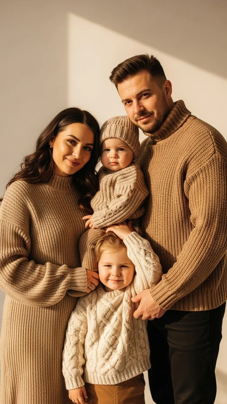 Sweater outfits make photos look warm and natural. Adults can wear chunky knits while kids wear sweater dresses or matching pullovers. Mix neutral tones or choose one color family. Add leggings, boots, or simple headbands to tie the look together. If you want to save, use existing sweaters and add layered scarves to create depth. This outfit style works for both indoor and outdoor shoots.