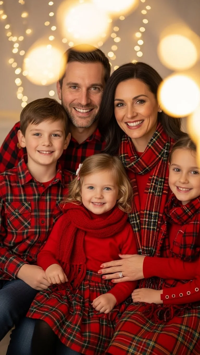 Red tartan adds holiday character without requiring full matching sets. Choose one tartan piece per person and fill the rest with neutrals. Kids look adorable in tartan skirts or suspenders. You can DIY tartan touches by using leftover fabric for bows or pocket accents. Keep shoes simple so the tartan remains the focus. This look shines in traditional holiday settings.