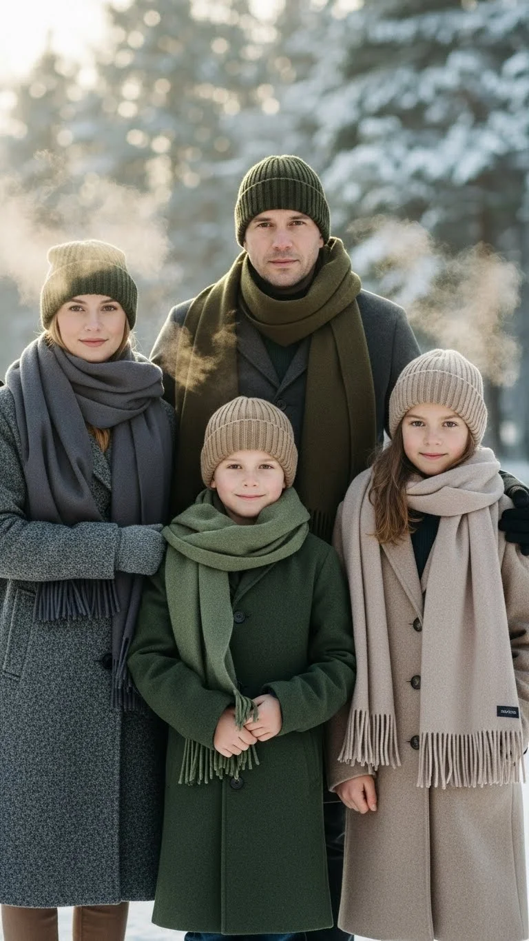 Wool layers create a warm, wintery feel perfect for outdoor photos. Use a mix of coats, scarves, and simple knits. Kids look cute in wool pea coats or cozy beanies. Add color through scarves or mittens if you want a fun touch. If you’re budget-conscious, layer neutral pieces you already have and use one accessory color to tie everything together. This look is great in snowy or woodsy backdrops.