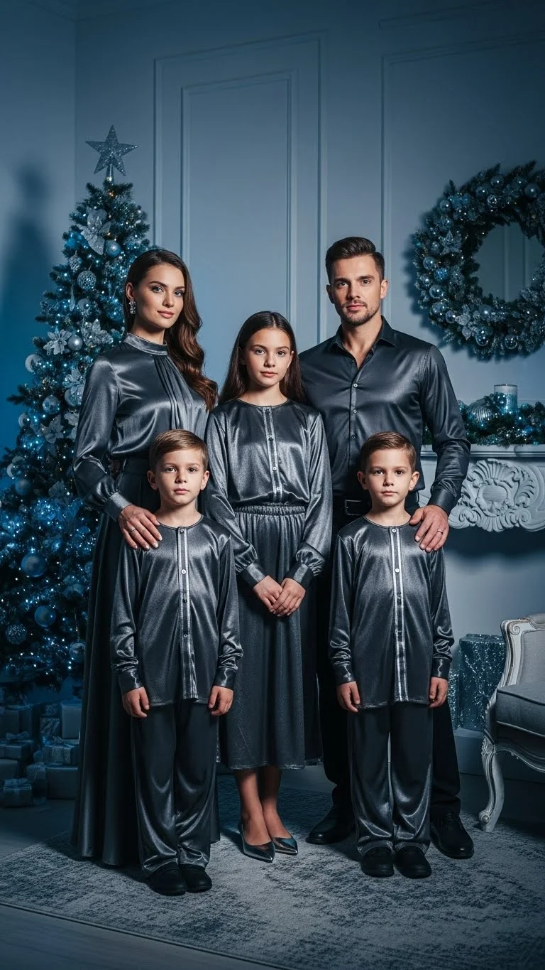 Charcoal and silver create a cool, modern look. Start with charcoal tops or pants, then add small silver touches through accessories or shoes. Kids can wear simple gray sweaters or sparkly silver shoes. Add texture with knits or ribbed tops to avoid flat tones. You can also use silver ribbon for inexpensive DIY accents. This color palette pairs well with modern holiday décor.