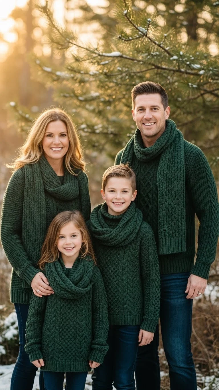 Forest green adds a warm, calm look to Christmas photos. It’s an easy color to match because it pairs well with denim, beige, and browns. Try layering green sweaters with neutral bottoms for a balanced look. Kids can wear simple green cardigans or corduroy overalls. If you don’t want to buy new pieces, add green accessories like hats or mittens. Keep patterns minimal so everyone blends together nicely without looking too matchy.