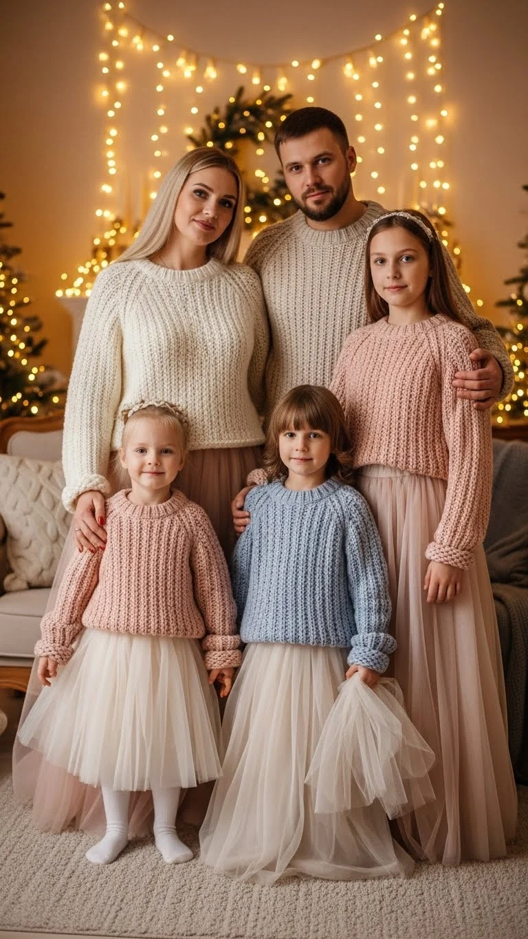 Sweaters paired with tulle skirts create a charming contrast. Adults can wear soft neutral knits while kids wear tulle skirts in light pink, cream, or red. Add leggings or boots for warmth. You can DIY tulle accents by tying layers of fabric onto hairbands or belts. This look brings a whimsical touch without requiring full matching outfits.