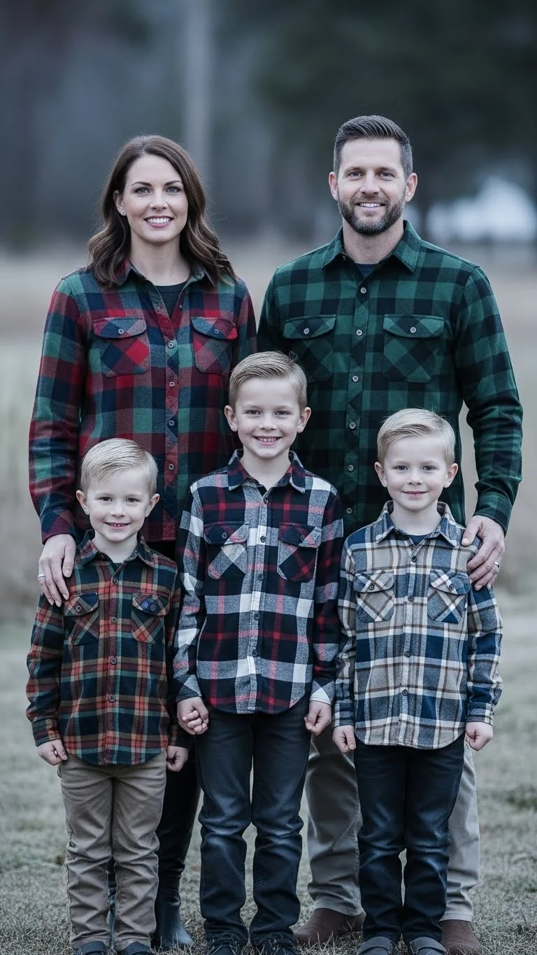 Flannel shirts give photos a relaxed, outdoorsy feel. Choose a color palette like red, navy, or green. Adults can wear flannel tops with beige or denim bottoms. Kids look adorable in flannel dresses or mini button-ups. Add neutral boots for a balanced finish. You can also tie flannel shirts around the waist for variety if you’re using what you already own.