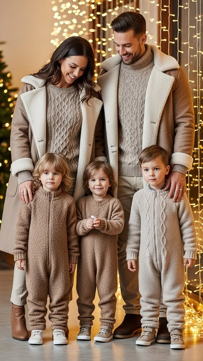 Neutrals create a calm and timeless style in photos. Use creams, tans, and browns, then build texture through sweaters, ribbed tops, or fleece layers. Kids often look adorable in neutral cardigans or soft sherpa vests. Add a plaid scarf or knit hat to break up the tones. You can easily DIY texture by layering neutral blankets or shawls. Neutrals are forgiving, so even mismatched shades blend well on camera.