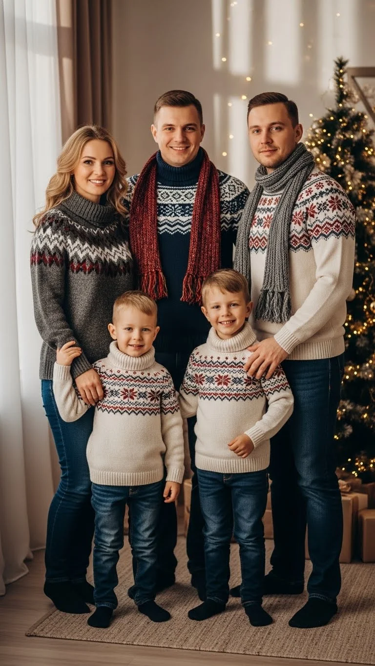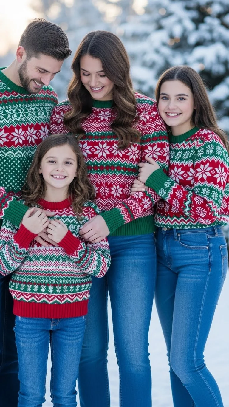 Christmas sweaters and jeans create a relaxed, friendly vibe. This look works well for families who want something simple without feeling too dressed up. Pick sweaters with similar tones or patterns so the photo still feels coordinated. Kids love sweaters with tiny trees, stars, or reindeer. If you want a quick DIY idea, sew small felt shapes onto plain sweaters. Add boots for a cozy winter finish.