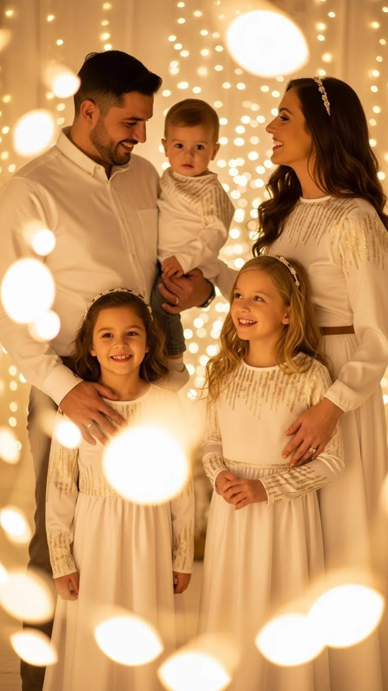 White and gold bring a soft, elegant touch without feeling heavy. Keep most of the outfits simple whites—sweaters, dresses, or button-ups. Add gold accents like headbands, belts, or small jewelry. Kids can wear gold shoes or sparkly hair clips for extra charm. If you’re avoiding new purchases, use gold ribbon to create DIY accessories. The colors reflect light beautifully, especially near holiday décor.