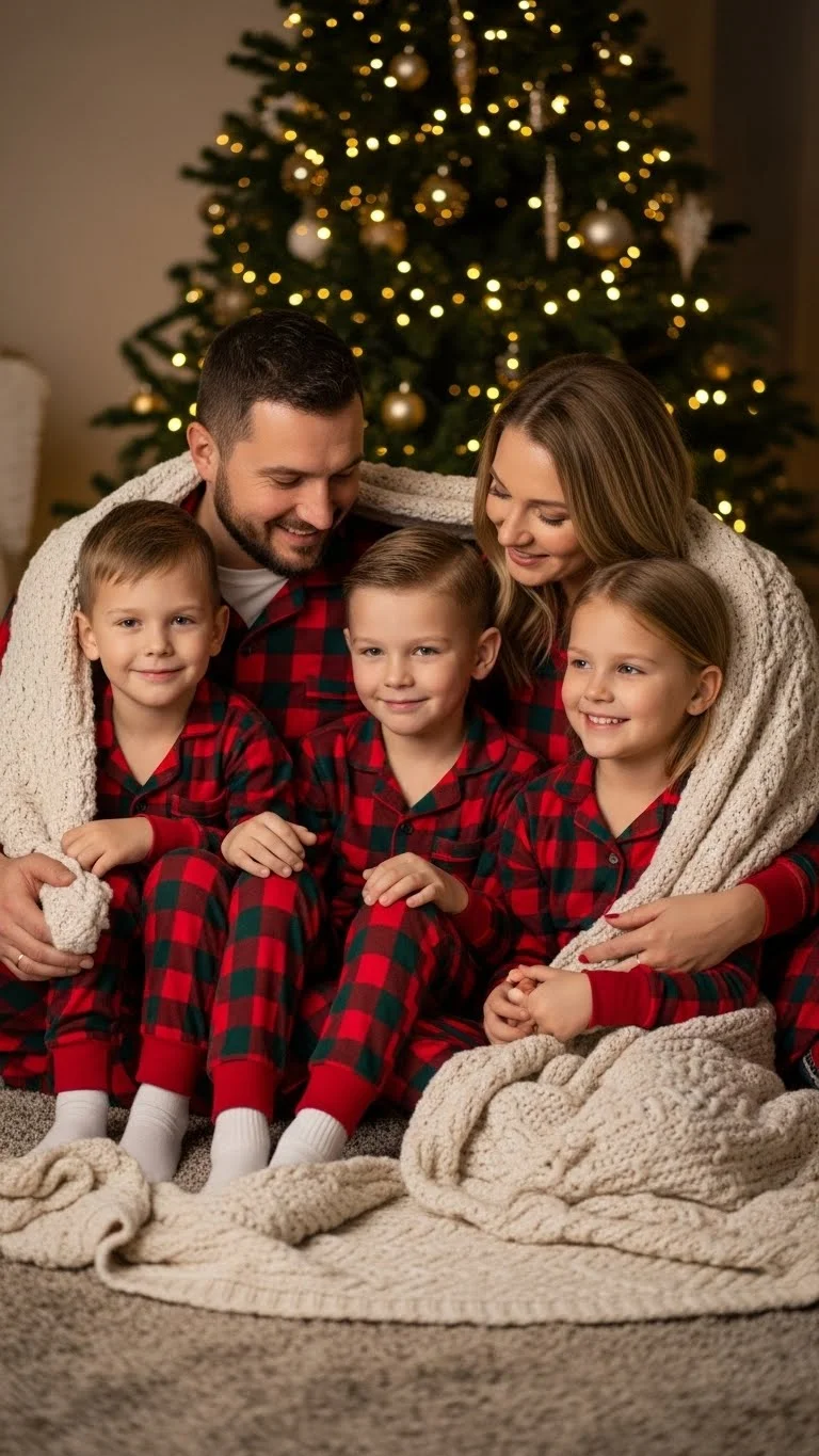 Matching pajamas bring a fun, relaxed feel to Christmas photos. Choose simple sets in red, green, or patterned flannel. Kids usually love pajama shoots because they feel comfortable and playful. Add blankets, mugs, or a basket of ornaments for a laid-back scene. You don’t have to buy matching sets—pair similar colors for a close enough look. Coordinate socks to add a cute finishing detail.