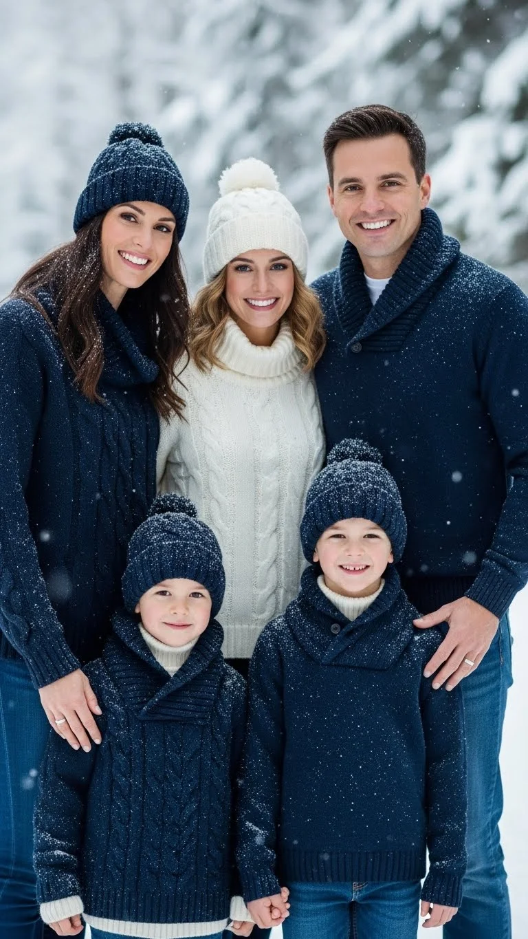 Navy and winter white create a calm color pairing that photographs well. Navy sweaters or dresses work with white jeans, tights, or tops. Kids can wear navy cardigans or simple white dresses with navy bows. Add neutral shoes to avoid busy contrasts. You can DIY navy accents by adding ribbon to shirts or headbands. This color pairing works especially well in bright outdoor settings.