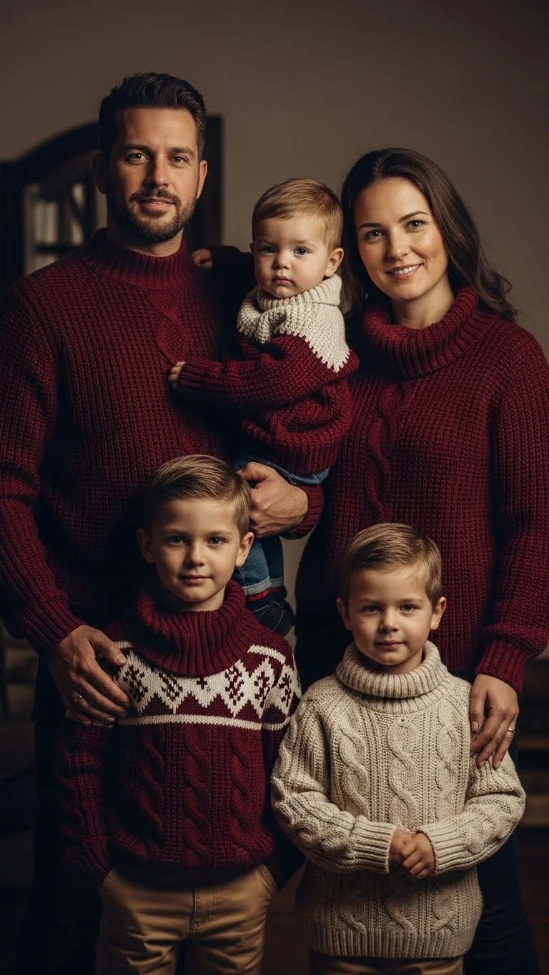 Burgundy adds depth without feeling too bold. Pair it with cream tops, skirts, or pants to create balance. Kids can wear burgundy dresses or pants with cream cardigans. Add small touches like burgundy bows or scarves to tie everyone together. If you’re working with what you already own, blend different shades of burgundy for a more natural mix. This color palette always photographs beautifully near holiday lights.