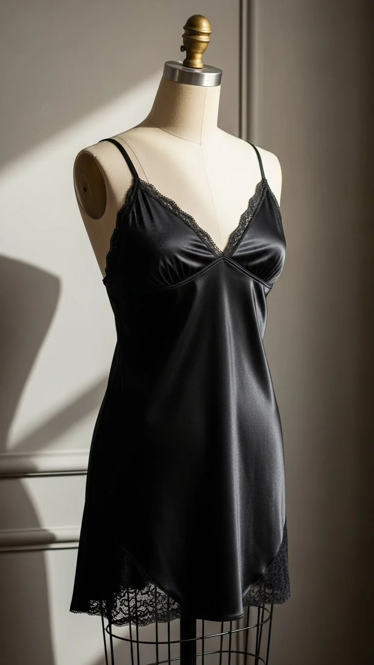 Satin slips with lace details feel feminine and delicate. Pair with matching panties or a robe. Budget-friendly: polyester satin works well. DIY: sew lace accents on hem or straps. Perfect for romantic evenings, it’s simple, stylish, and confidence-boosting.