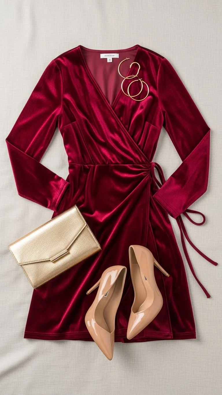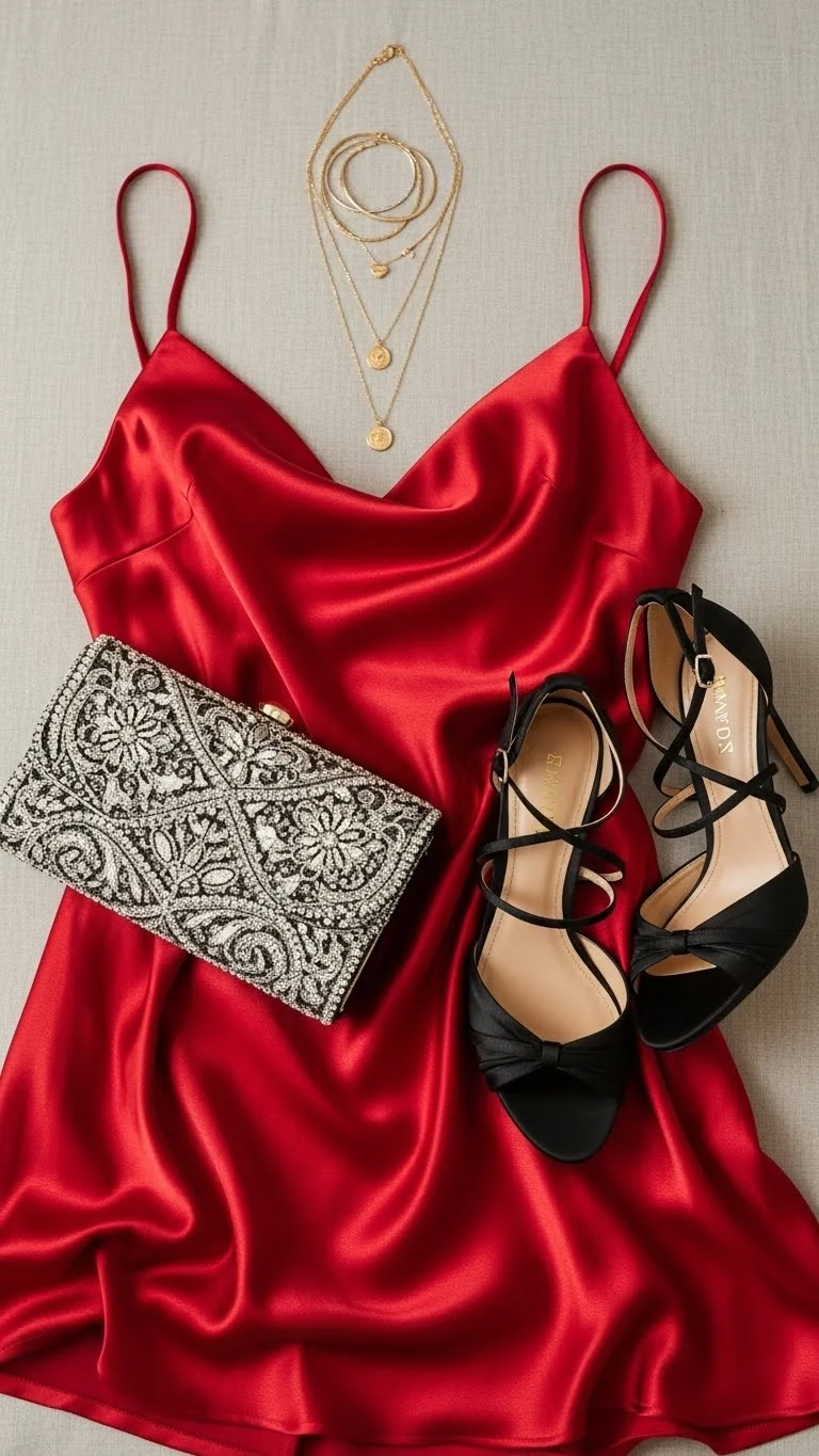 - Dresses: Satin, velvet, or sequin dresses in red, blush, or jewel tones