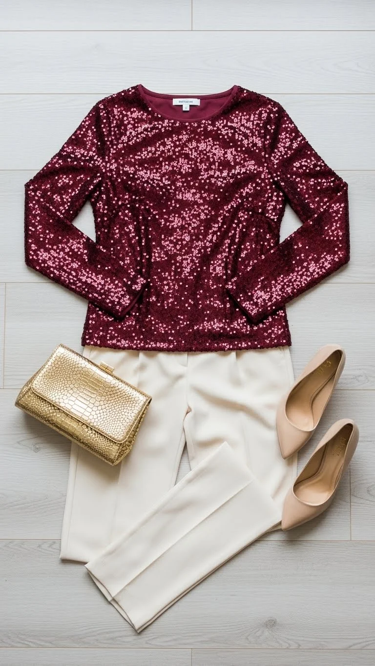 - Metallic or sequined tops paired with neutral bottoms