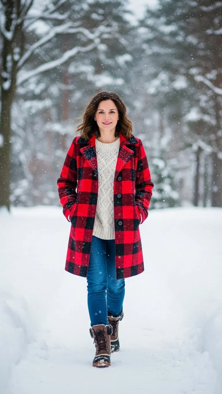 Plaid coats add color and charm. Budget-friendly: thrift plaid jackets. Layer sweaters underneath for warmth. Footwear: ankle boots. Ideal for city strolls or casual gatherings.