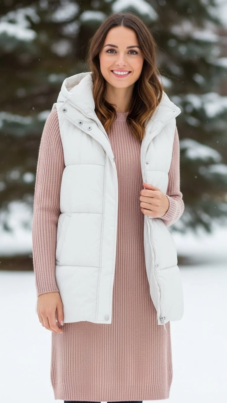 Layer a puffer vest over a knit dress for extra warmth. Budget: thrift vests. Footwear: boots. DIY: add pins or embroidery to vest. Ideal for outdoor winter Valentine plans.