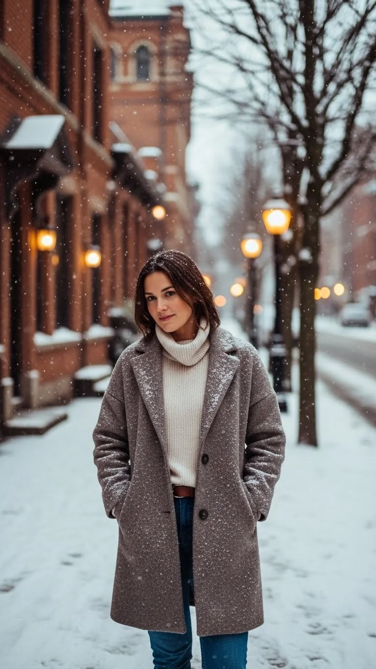 A fitted coat with matching scarf and gloves looks polished. Budget: thrift classic coats and DIY matching accessories. Footwear: ankle or knee-high boots. Great for walks, shopping, or outdoor dinners.
