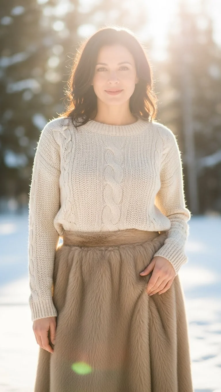 Faux fur skirts feel cozy and luxurious. Pair with sweaters and boots. Budget: thrift skirts or DIY fur panels. Accessories: minimal jewelry. Perfect for brunches or casual indoor dates.