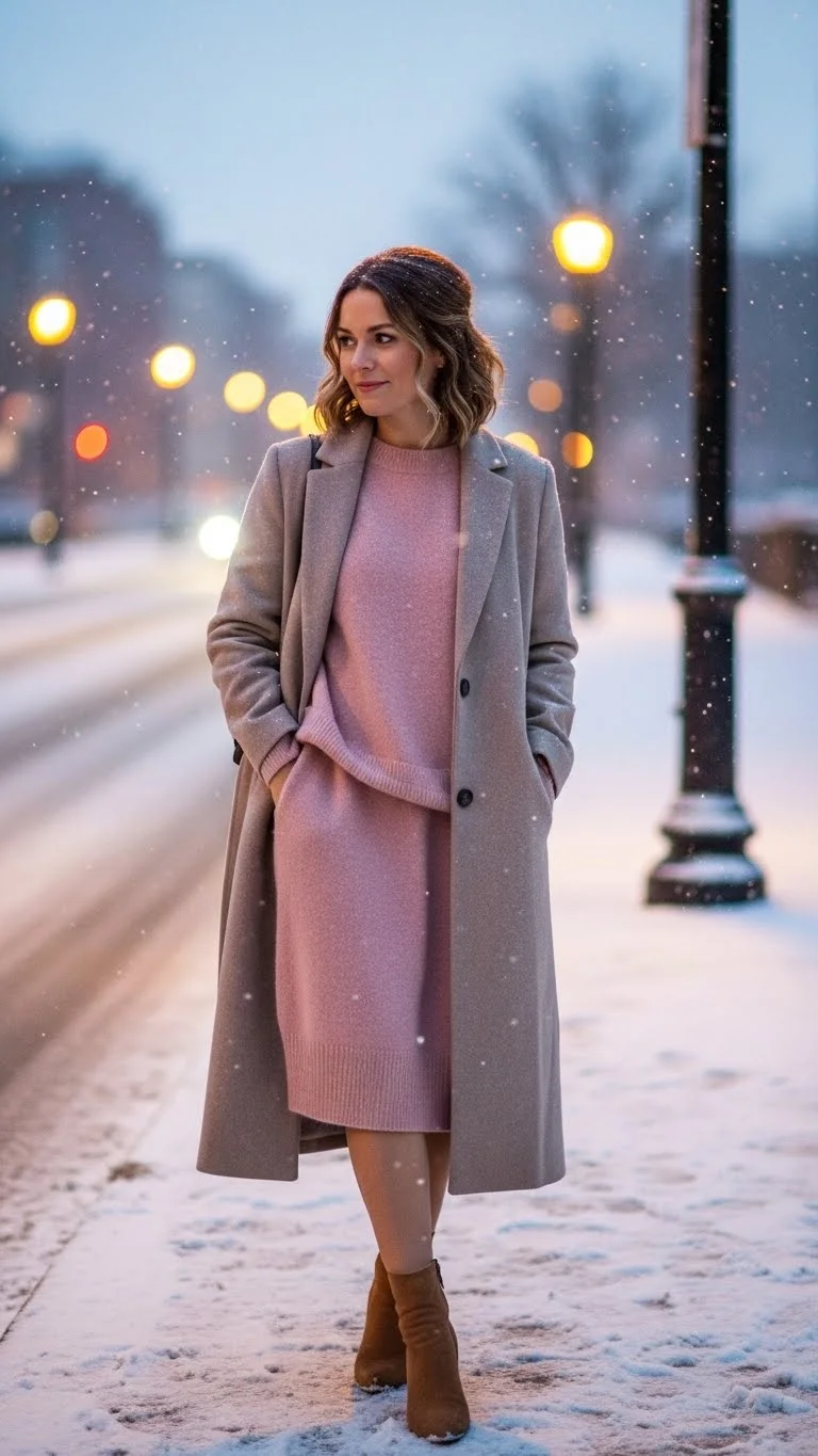 Layer a sweater dress under a long coat for chic warmth. Budget: thrift coats and dresses. Footwear: boots. DIY: add scarves or pins for flair. Perfect for dinner dates or winter walks.