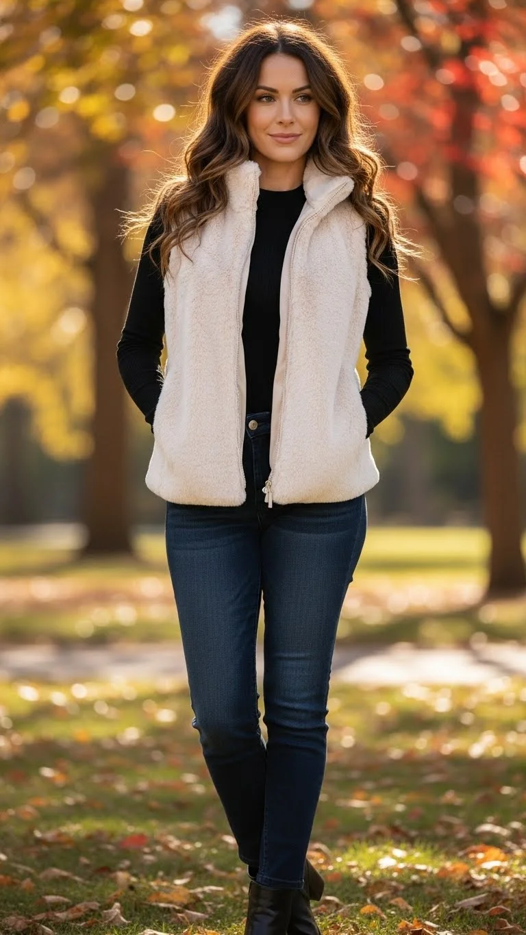 A faux fur vest adds texture and warmth. Affordable: find second-hand vests or DIY by adding faux fur panels to old vests. Pair with boots and skinny jeans. Simple accessories keep the outfit chic. Ideal for casual winter Valentine outings or city walks.