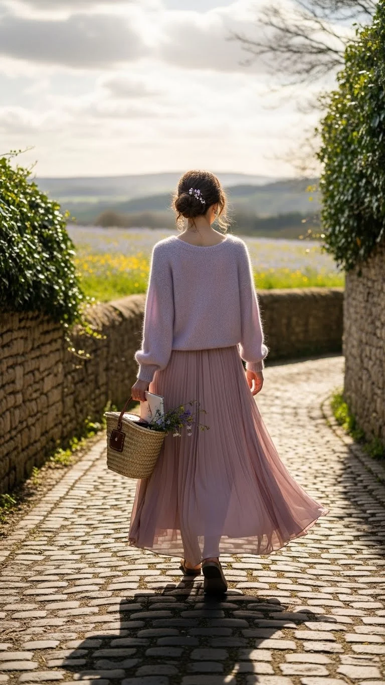 Pairing a sweater with a pleated skirt balances comfort with femininity. Budget-friendly: thrift plain sweaters and skirts. DIY: add a ribbon belt or embroidery for personal style. Footwear: flats or boots. Great for brunches or casual indoor dates.