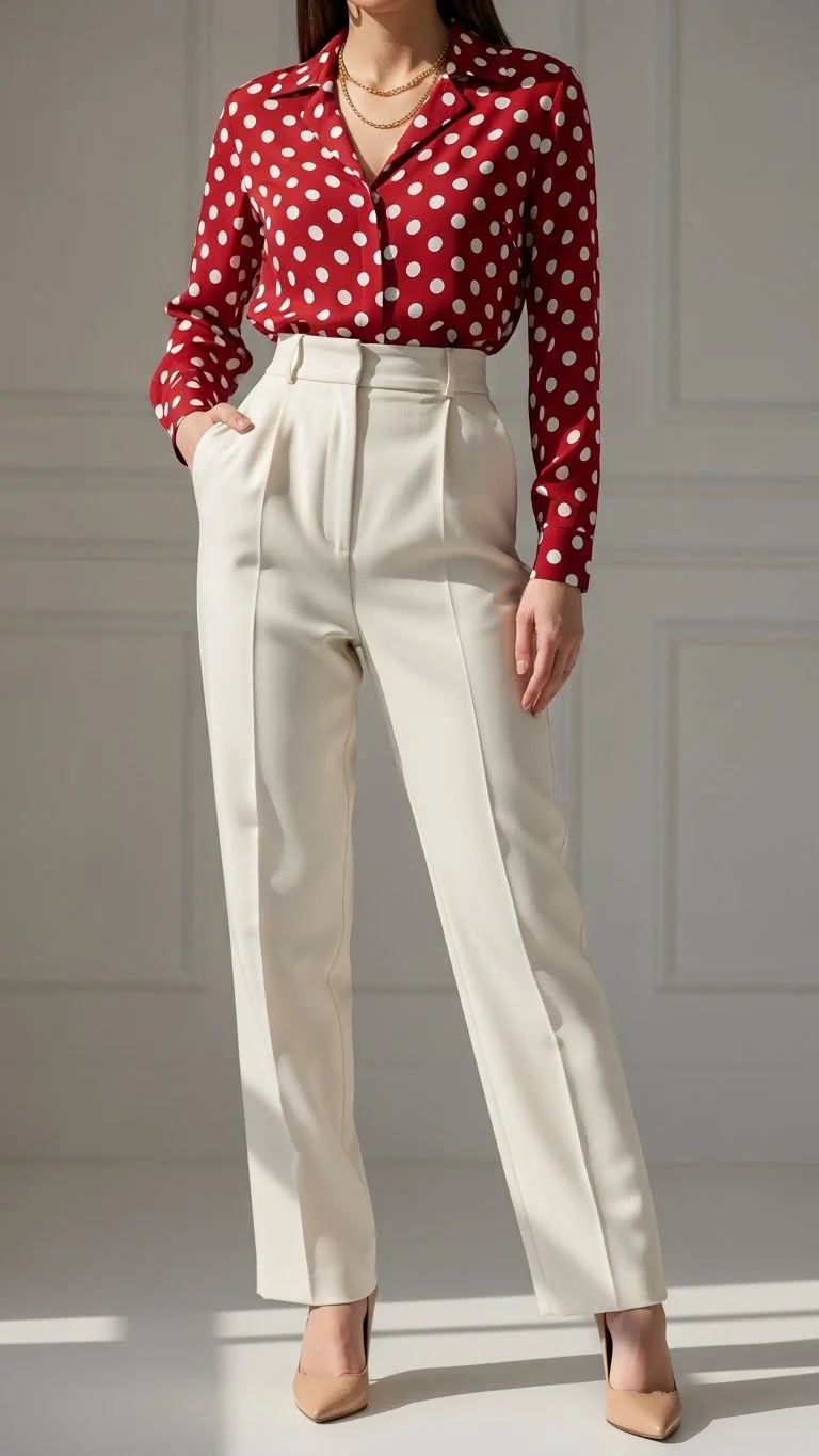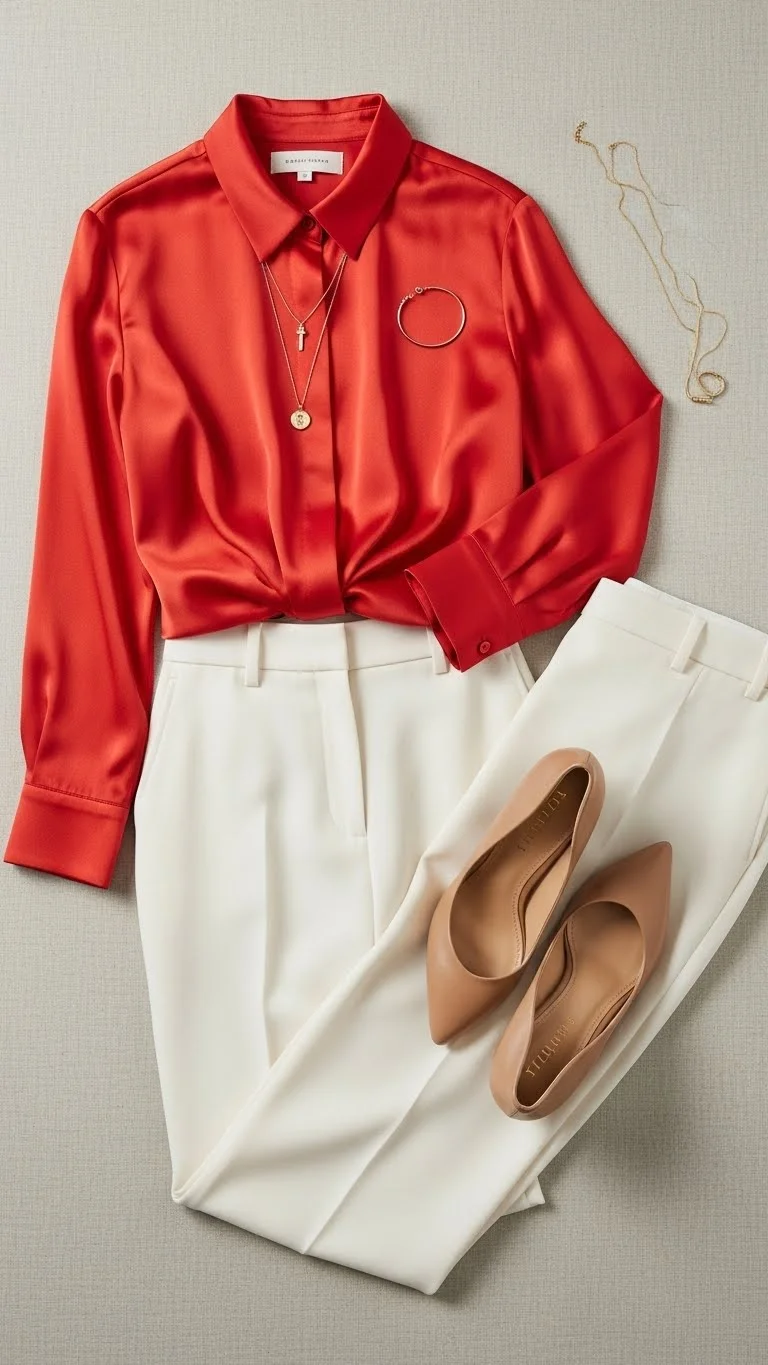 - Red top: Pair a silky blouse or sweater with neutral bottoms